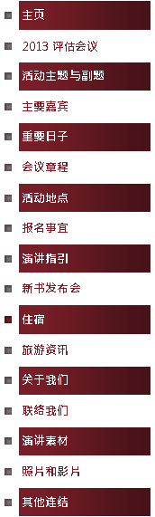 主页| 2013评估会议 | 主题与副题 | 主要嘉宾 | 重要日子 | 会议章程| 活动地点 | 报名事宜 | 演讲指引 | 新书发布会 | 住宿 | 旅游资讯 | 关于我们 | 联络我们 | 演讲素材 | 照片和影片 | 其他连结