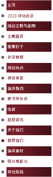 主页| 2013评估会议 | 主题与副题 | 主要嘉宾 | 重要日子 | 会议章程| 活动地点 | 报名事宜 | 演讲指引 | 新书发布会 | 住宿 | 旅游资讯 | 关于我们 | 联络我们 | 演讲素材 | 照片和影片 | 其他连结