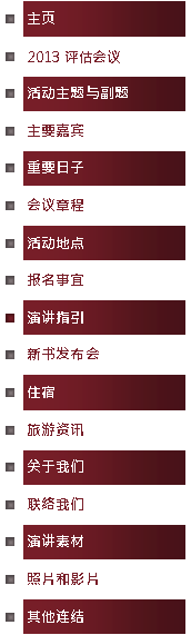 主页| 2013评估会议 | 主题与副题 | 主要嘉宾 | 重要日子 | 会议章程| 活动地点 | 报名事宜 | 演讲指引 | 新书发布会 | 住宿 | 旅游资讯 | 关于我们 | 联络我们 | 演讲素材 | 照片和影片 | 其他连结