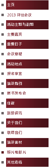 主页| 2013评估会议 | 主题与副题 | 主要嘉宾 | 重要日子 | 会议章程| 活动地点 | 报名事宜 | 演讲指引 | 新书发布会 | 住宿 | 旅游资讯 | 关于我们 | 联络我们 | 演讲素材 | 照片和影片 | 其他连结