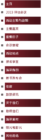主页| 2013评估会议| 主题与副题 | 主要嘉宾 | 重要日子 | 会议章程| 活动地点 | 报名事宜 | 演讲指引 | 新书发布会 | 住宿 | 旅游资讯 | 关于我们 | 联络我们 | 演讲素材 | 照片和影片 | 其他连结