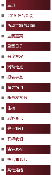 主页| 2013评估会议 | 主题与副题 | 主要嘉宾 | 重要日子 | 会议章程| 活动地点 | 报名事宜 | 演讲指引 | 新书发布会 | 住宿 | 旅游资讯 | 关于我们 | 联络我们 | 演讲素材 | 照片和影片 | 其他连结
